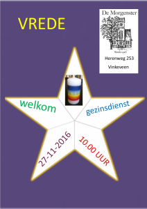 zondag 27 november 2016 om 10.00 uurGezinsdienst 1e AdventVoorganger(s): Ds. A.W. Aarnoutse Organist: Jaap Rietdijk We starten de Adventsperiode met een Gezinsdienst waarin de kinderen centraal zullen staan. Het thema van deze dienst zal zijn VREDE. Iedereen is van harte welkom! Na de dienst kunt u gezellig een kopje koffie, thee of limonade komen drinken. |