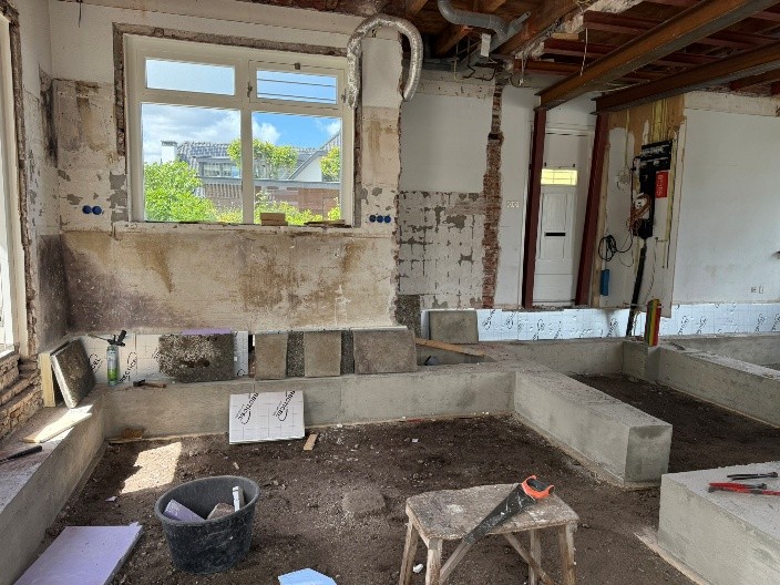 Na de sloop zijn er 14 nieuwe palen geslagen en is er een nieuwe fundering vastgemaakt aan de oude. Op deze fundering is een nieuwe, betonnen vloer aangebracht. Hierop zal over niet al te lange tijd vloerverwarming worden aangebracht. Nieuwe tussenmuren zijn gemetseld en nieuwe ‘binnen kozijnen’ gesteld. De contouren van de verschillende vertrekken zijn daarmee weer zichtbaar geworden.
