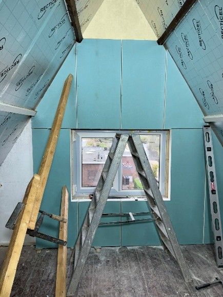 Nu, bijna een jaar verder, schieten we aardig op. De zolderverdieping en de eerste verdieping zijn, wat isolatie betreft, klaar. We zijn daar druk bezig met het aanbrengen van de nieuwe plafonds en wanden. Over niet al te lange tijd hopen we dat de stukadoor zijn werk kan komen doen. Wij gaan ons langzaam richten op de benedenverdieping. Een mooi vooruitzicht.